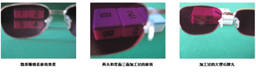 普通的麻将经过加工后肉眼看不出,戴上隐形眼镜可看得非常清楚,这是一种成熟、实用的产品,适用于玩扑克、打麻将、推筒子、推牌九等认牌。
